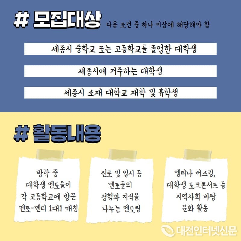 우리누리 대학생 멘토단 모집 - 오는 12월 13일까지 대학생 멘토단, 세종 우리누리 모집...겨울방학 동안 세종시 고등학생 대상 멘토링 활동