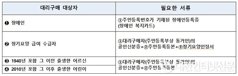 대리구매는 장애인, 장기요양 급여 수급자, 1940년 포함 그 이전 출생한 어르신, 2010년 포함 그 이후 출생한 어린이에 한해 가능하며, 구매대상자의 출생연도에 맞춰 구매해야 한다.
