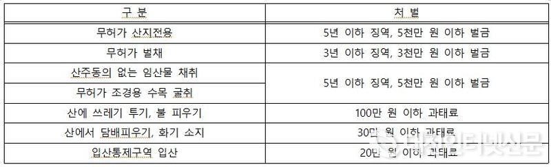 불법산림훼손 관련 처벌 규정(출처-산림청)