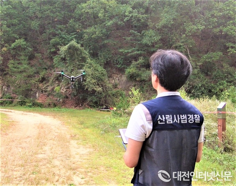산림청 산림사법경찰이 불법산림훼손 단속을 위해 드론을 띄우고 있다.(사진-산림청)