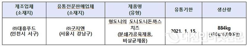 [대전 인터넷신문=종합/박완우 기자] 식약처는 인천시 수거·검사결과 식육 가공업체 ㈜대흥푸드(인천시 서구 소재)가 제조하고 유통전문 판매업체인 ㈜굿지앤이 판매한 ‘형도니의 도니도니돈까스 치즈’ 제품(분쇄가공육제품)에서 장출혈성 대장균이 검출되어, 해당제품을 판매중단 및 회수 조치한다고 밝혔다.