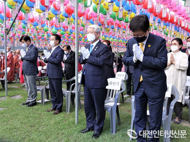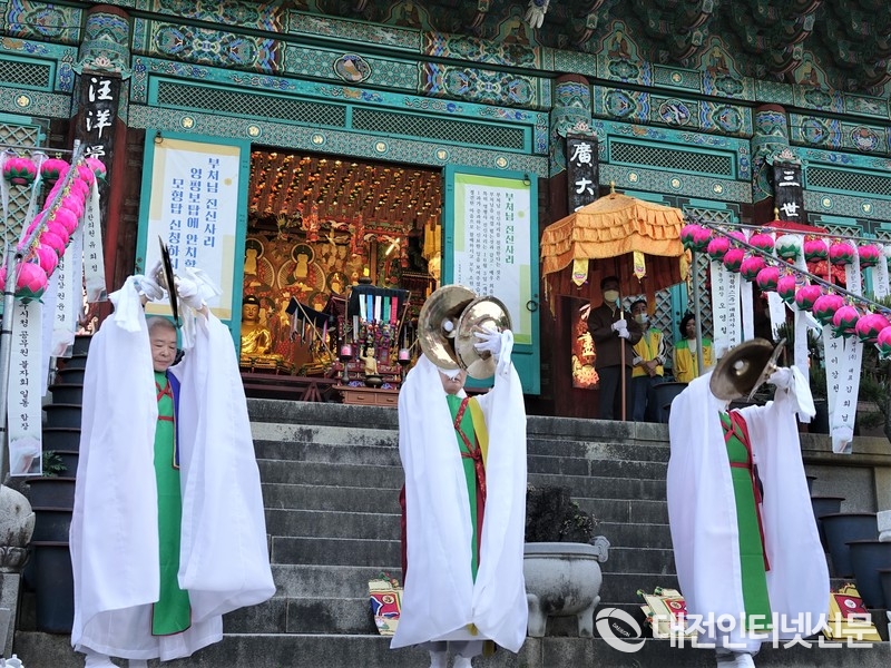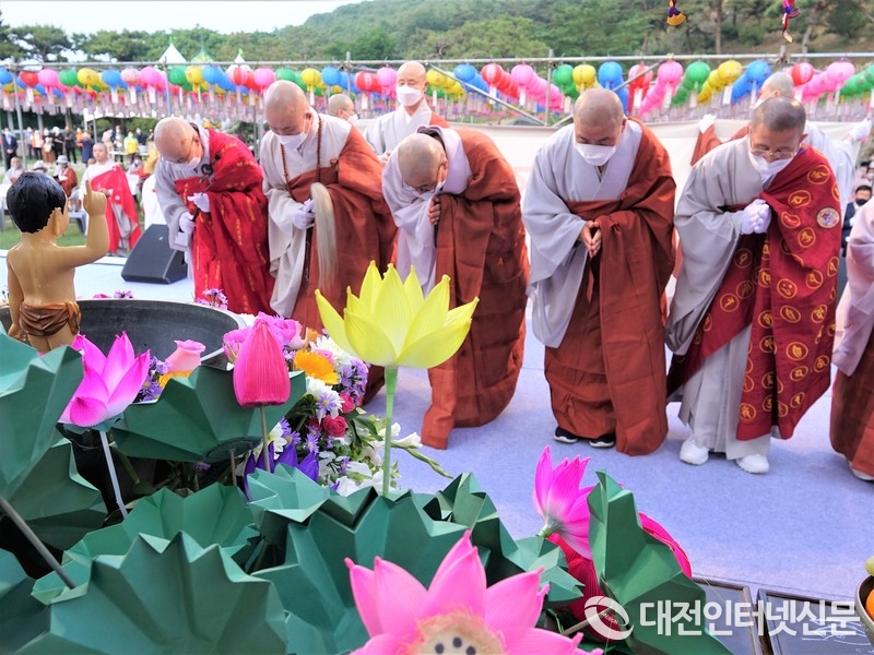 [대전인터넷신문=세종/박향선기자] 코로나19 지속 여파로 부처님 오신 날 기념행사가 1달 미뤄진 가운데 5월 23일 부처님 오신 날 ‘국태민안’ 봉축 법요식이 세종시 장군산 영평사 경내에서 개최되었다.