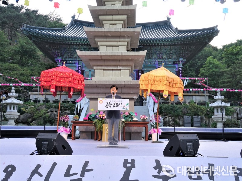 이춘희 시장이 불기 2564년 부처님 오신날 봉축 법요식이 열린 영평사에서 봉축사를 하는 모습. [사진-대전인터넷신문]