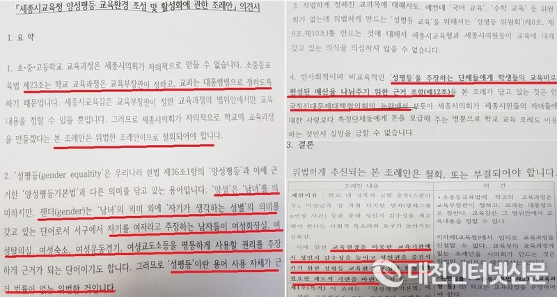 지난 8일 세종시청에서도 시민단체가 위법하게 추진되는 양성평등 조례안은 철회하거나 회의에서 부결시킬 것을 세종시의회에 강력하게 촉구하는 기자회견에서 "이 조례안이 담고 있는 것은 세종시의회가 세종시민들의 자녀들에 대한 사랑보다 특정 단체들에 돈을 지급해 주는 명분으로 학교 교육 조례를 이용하는 것인지 실망을 금할 수 없다는 목소리와 함께 세종시교육청 양성평등 교육환경 조성 및 활성화에 관한 조례안을 철회하거나 회의에서 부결시켜 줄 것을 요구한 바 있다.