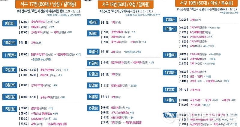 대전 49번(서구 19번) 확진자의 경우 10일 대중교통(버스)을 이용 괴정동 소재 다단계판매시설을 방문했고, 근처 식당에서 점심식사 후 대중교통을 이용 자택으로 귀가했으며 다음날인 11일에도 버스와 지하철을 이용한 것으로 밝혀지면서 접촉자들의 동선파악이 시급한 것으로 나타났다.