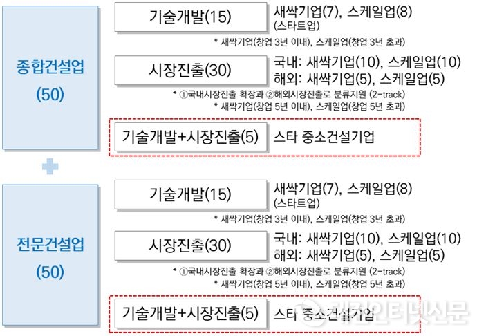이번 100대 중소건설기업 선정은 종합·전문 건설업 구분없이 모든 중소건설기업을 대상으로 이루어진다. 또한, ①기술개발(30%), ②시장진출(60%), ③기술개발·시장진출(10%)로 분류하여 분야별로 경쟁력을 갖춘 건설혁신 선도기업을 선정해 나간다는 계획이다.