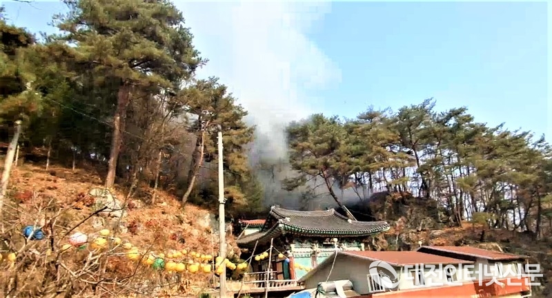 기상 상황은 바람 남남서 0.4m/s, 현재 잔불진화와 뒷불감시 중이며, 피해면적은 0.1ha으로 발생 원인은 사찰 뒤편에서 잔가지와 낙엽 등을 소각하는 과정에서 불씨취급 부주의로 인해 산불이 발생한 것으로 파악하고 있다.