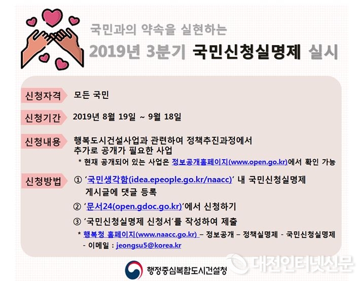 [대전인터넷신문=세종/권혁선 기자] 행복청은 국민이 원하는 정책과 사업이 투명하게 공개될 수 있도록 ‘20년도 4분기 국민신청실명제 대상사업을 11월 20일(금)부터 12월 20일(일)까지 접수한다고 밝혔다.