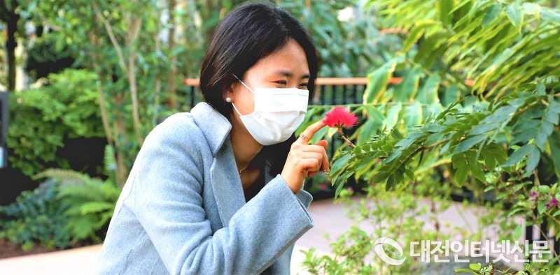 관람객이 사계절 전시 온실 열대 온실에 있는 칼리안드라 해마토케팔라를 보고 있다.(사진-국립세종수목원)