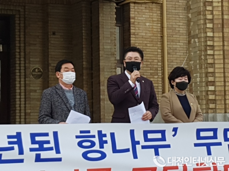 대전 중구의회 김연수 의장이 옛 충남도청사 내 향나무를 훼손한 대전시를 규탄하는 기자회견을 앞두고 참석한 기자들과 대화를 나누고 있다. 옛 충남도청사는 근대건축물의 희소성으로 그 가치를 인정받아 등록문화제 제 18호로 등록되어 있어 각종 영화와 드라마 촬영지로 인기를 모으고 있는 장소이다(사진-대전인터넷신문)