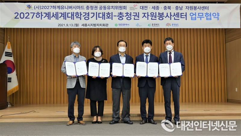 [대전인터넷신문=세종/최대열기자] 2027하계유니버시아드대회 충청권 공동유치위원회(사무총장 김윤석)가 13일 세종시지방자치회관에서 세종시자원봉사센터 및 대전·충북·충남 충청권자원봉사센터와 U대회 유치·운영에 대해 상호 협력하는 협약을 체결했다.