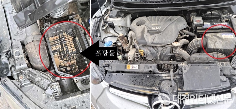 흙탕물에 침수된 차량이 견인되는 모습. [사진-대전인터넷신문]