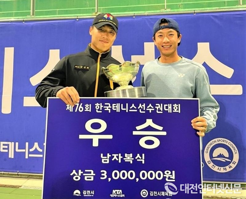 [대전인터넷신문=세종/권혁선 기자] 세종시청 테니스팀 소속 국가대표 홍성찬 선수와 국군체육부대 신산희 선수로 이뤄진 팀이 지난 30일 경북 김청 종합스포츠타운에서 열린 ‘제76회 한국테니스선수권대회’에서 남자 복식 부문 우승을 차지했다.