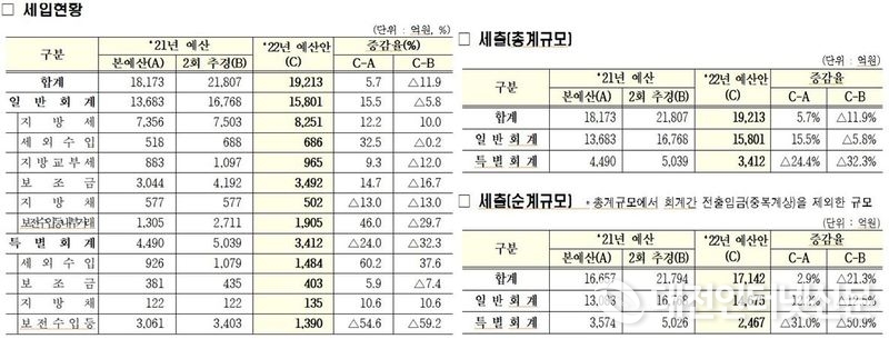 세입예산은 21년 공동주택 7,668호 공급물량 대비 내년도 예상공급물량인 1,595호로 입주 물량 감소와 부동산 거래 위축 등으로 인한 취득세가 올해 2,428억 원보다 3.8% 줄어든 2,335억 원으로 예상되지만 지방 소비세율 인상과 과세대상 증가 등을 고려, 내년 지방세 수입을 올해보다 895억 원(12.2%) 증가한 8,251억 원으로 편성하였다.