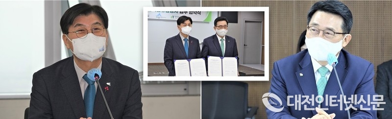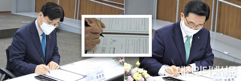 협약서에 서명하는 이춘희 시장과 김춘진 사장. [사진-대전인터넷신문]