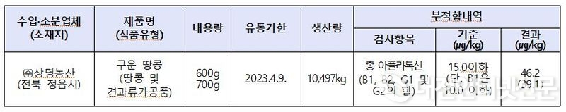 ㈜상명농산(전북 정읍시)의 수입·소분업체 구운 땅콩[사진-식약처]
