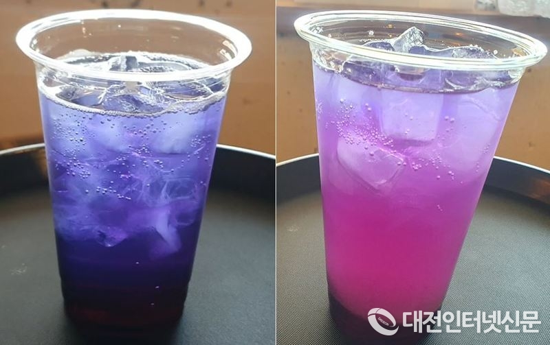 ‘나비완두콩 꽃’ 추출물을 ‘에이드’ 음료에 첨가(파란색 → 보라색 변화) [사진-식약처]