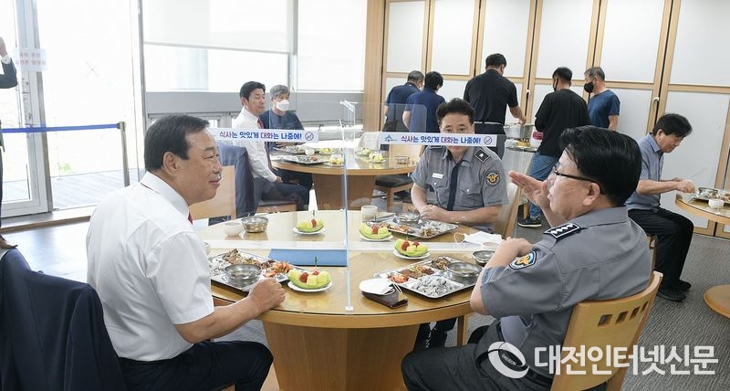 최민호 시장이 현장직원들과 식사를 하며 이야기를 하고 있는 모습[사진-세종시]