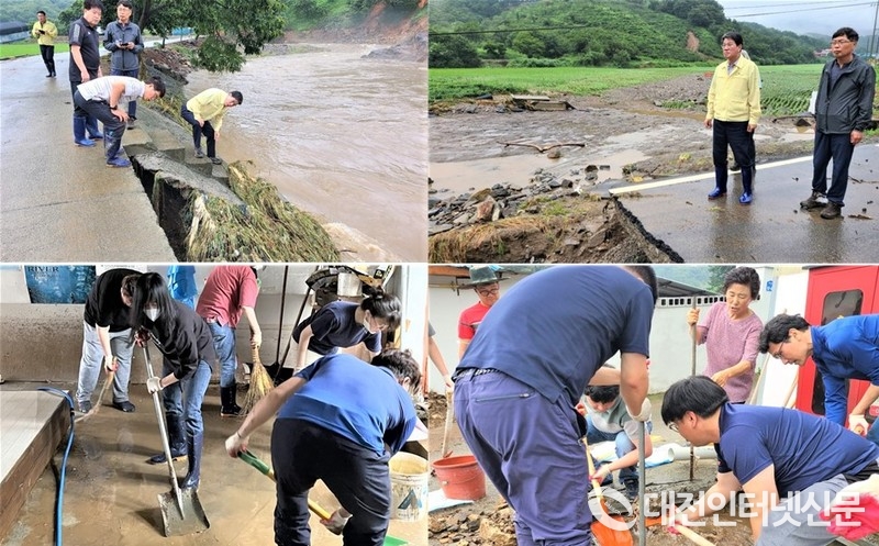 김돈곤 청양군수가 호우로 파손된 시설을 점검하고 군 공무원들이 재난 현장 긴급 복구하는 모습. [사진-청양군 제공]