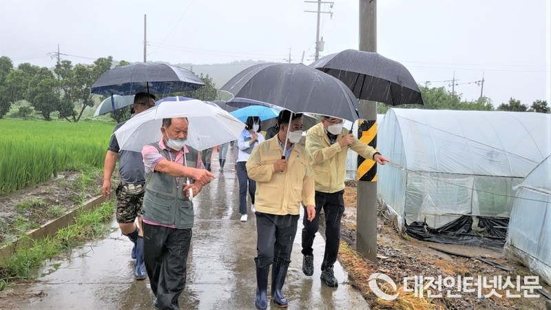 박정현 부여군수가 관내 농경지 침수현장을 점검하고 있다. [사진-부여군 제공]