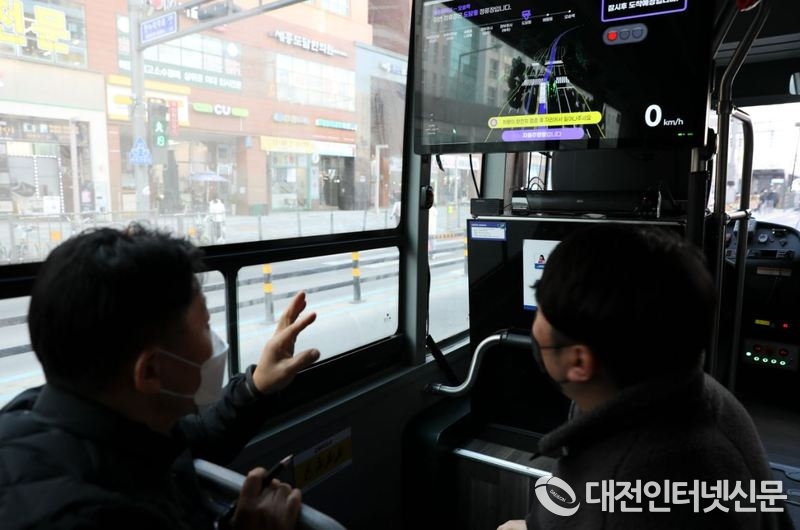 [대전인터넷신문=세종/권혁선 기자] 최임락 행복청 차장이 세종시외버스터미널에서 오송역 간 운행 중인 충청권 자율주행 버스를 시승하고 있다.