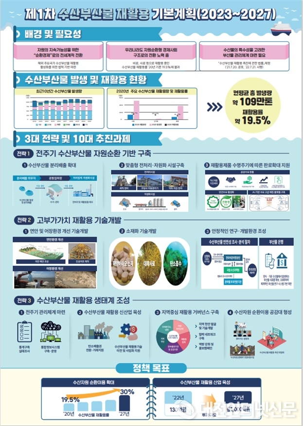 해부터 수산부산물 실태조사를 실시해 수산부산물 맞춤형 자원순환 지표를 발굴할 방침이다. 지금까지 폐기 처리 위주였던 수산부산물 산업 구조가 재활용 중심으로 전환될 수 있도록 탄소배출권 거래 지원, 수산부산물 처리업에 대한 정책자금 지원 등 각종 인센티브도 제공한다.