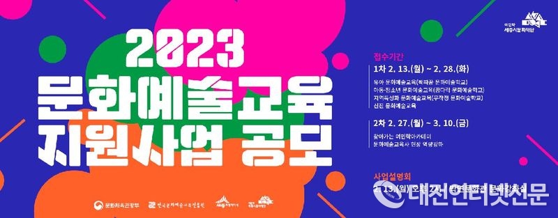 [대전인터넷신문=세종/권혁선 기자] 세종시문화재단이 문화예술교육 활성화와 시민의 문화예술 향유 기회 확대를 위한 2023년 문화예술교육 지원 사업 공모를 진행한다.