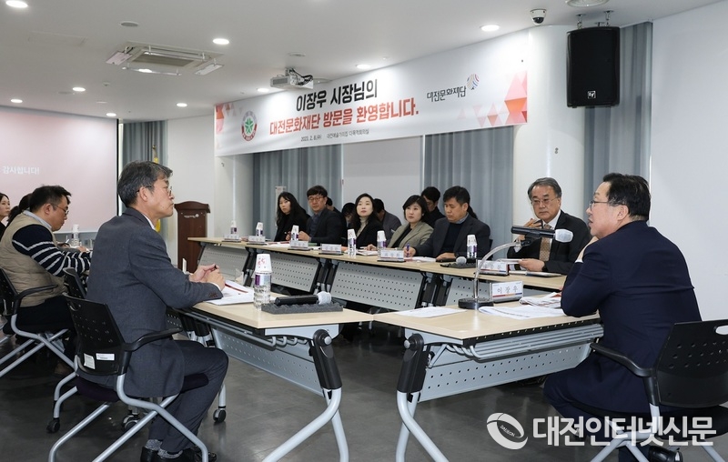 문화재단을 찾은 이장우 대전시장은 업무보고를 받고 직원과의 대화를 실시했다. [사진-대전시]