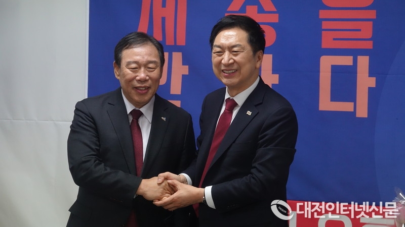 최민호 시장(좌)과 김기현 후보(우)가 반갑게 인사를 나누고 있다. [사진-대전인터넷신문]