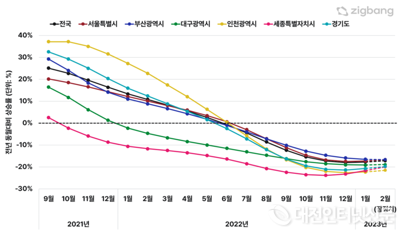 이른 침체를 겪은 세종과 대구를 제외한 지역은 대부분 2022년 7월부터 전년 대비 마이너스 추세로 돌아섰다. 특히 2021년에 상승세가 컸던 경기, 인천 지역의 하락 전환이 가팔랐다.