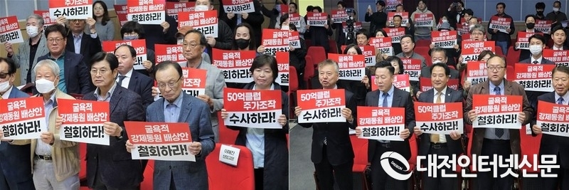 이춘희 세종시당 상임고문과 이해찬 상임고문, 홍성국 의원, 정봉주 중앙당 교육연수원장 등 당원100여명이 퍼포먼스를 하고 있는 모습. [사진-대전인터넷신문]