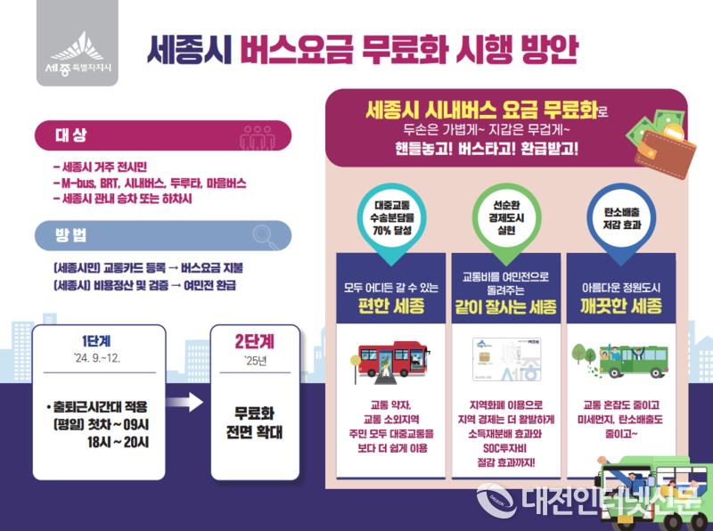 [대전인터넷신문=세종/백승원 기자] 세종시가 오는 2024년부터 9월부터 출근과 퇴근시간 시내 버스요금 무료화를 시작으로 2025년은 전면 무료화한다는 계획이다.