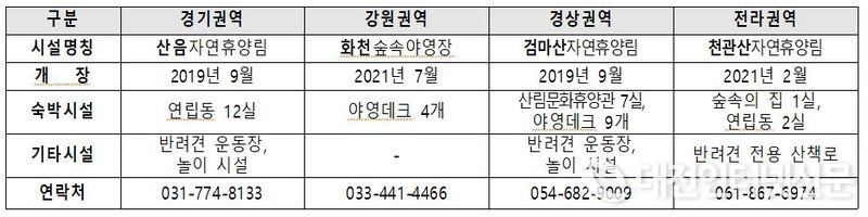반려견 동반 국립 산림휴양시설 현황[자료-산림청]
