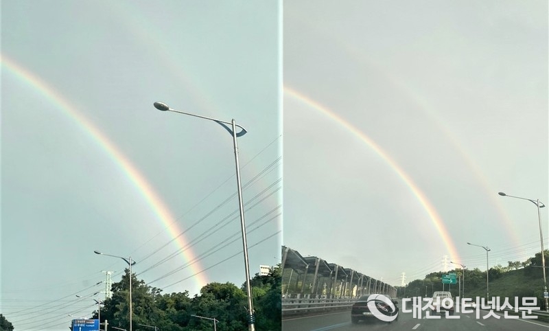 26일 오후 비가 그치면 나타나는 무지개가 세종-대전 BRT도로에 나타나면서 역대급 장마의 끝을 알리고 있다. [사진-독자제공]