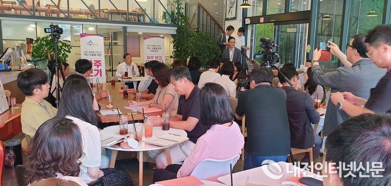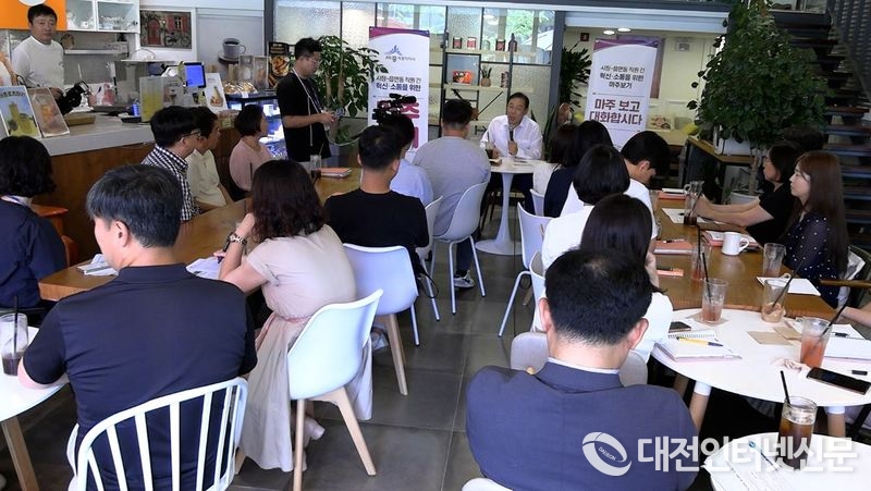 최 시장이 25일 한솔동의 한 카페(노을3로 84 1층)에서 연동·금남·장군·연서면, 한솔동 직원 40여 명과 ‘제4차 마주보기’행사를 가졌다. [사진-대전인터넷신문]