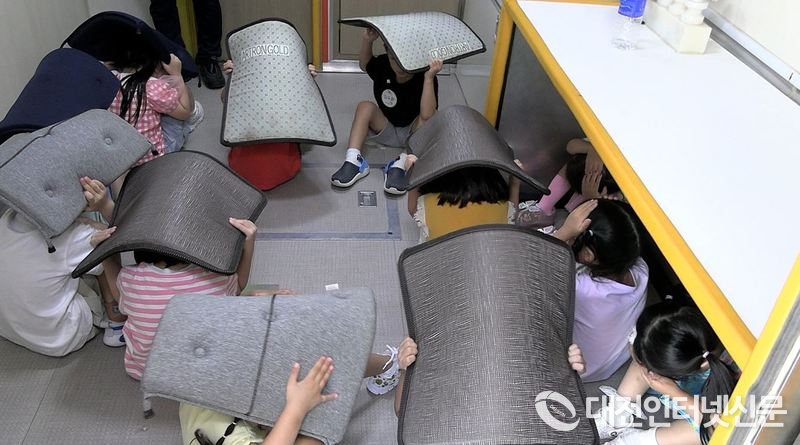 지진 등 자연재난안전에 대한 어린이 안전체험교실이 어린이 눈높이에 맞게 진행되고 있다.[사진-대전인터넷신문]
