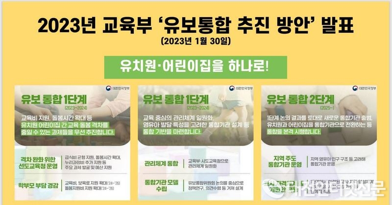한편 세종시교육청은 2023년 유보통합 선도교육청으로 선정되어 완전한 유보통합 이전에 지역의 자원을 활용한 준비를 선제적으로 추진하는 역할을 맡게 되면서, ▲장애영유아 지원 프로그램 기획 ▲ 공동교육과정 운영 ▲안전체험교육 ▲교사 역량 강화 지원 등 추진 과제를 부여받아 본격 시행하게 됐다.