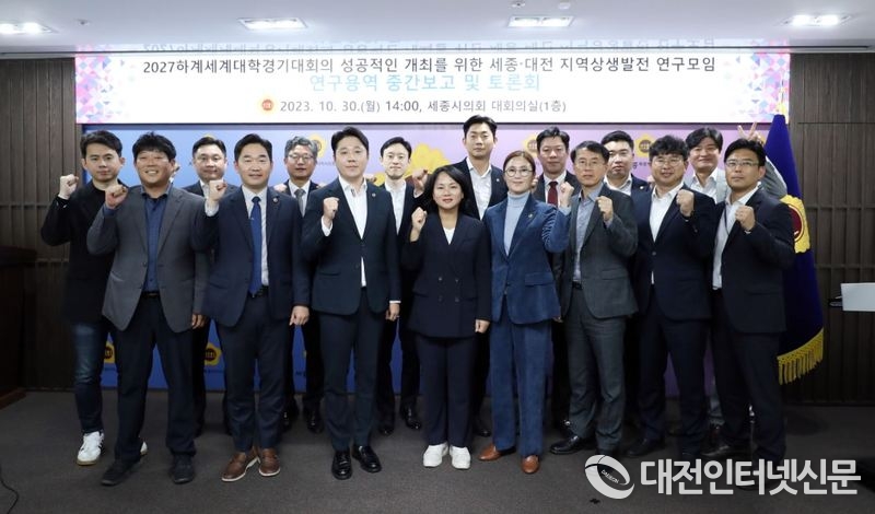 ‘2027 하계세계대학경기대회의 성공적인 개최를 위한 세종·대전 지역상생발전 연구모임은 30일 오후 14시 세종시의회 대회의실에서 연구용역 중간보고 및 토론회를 열었다.[사진-세종시의회]