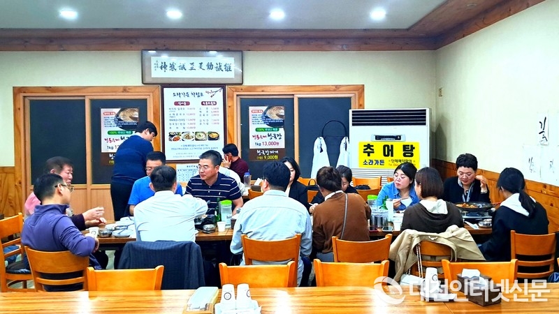 30일 저녁 도착한 중국여행사 관계자들이 세종시 한 식당에서 식사를하며 쇼핑센터 부재를 아쉬운점으로 토론하고 있다. [사진-대전인터넷신문]