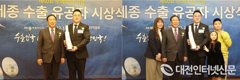 5백만불탑 표창을 전수하는 최민호 시장과 에스에이치트레이딩 대표와 가족들. [사진-대전인터넷신문]