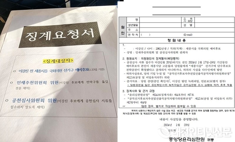 26일 자신을 평범한 민주당원이라고 소개한 K 씨는 최근 “중앙당의 요청”이라며 세종 을에서 세종 갑으로 갑자기 출마지역을 변경한 이강진 예비후보와 이강진 예비후보에게 “출마지역을 옮길 것”을 제의(요청한) 인재추천위원과 “공천심사 서류를 접수하지 말 것”을 제의(요청)한 공천심사위원회 관계자 등이 포함된 징계요청서를 23일 접수했다고 밝히면서 이강진 예비후보에 대한 사전 밀실 공천이 당내 내홍으로 비화할 조짐을 보이고 있다.