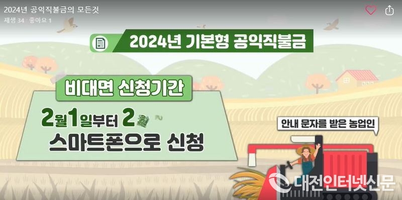 [대전인터넷신문=세종/권혁선 기자] 세종시가 내달 1일부터 오는 4월 30일까지 기본형 공익직불제 신청·접수를 진행한다.