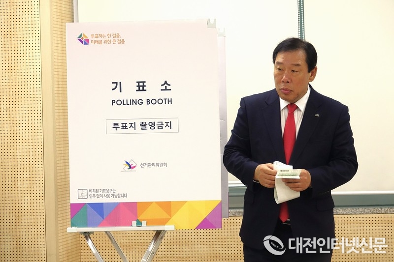 사전투표 첫날 출근 전 조치원읍사무소에 마련된 사전투표소에서 소중한 한표를 행사하는 최민호 세종시장. [사진-대전인터넷신문]