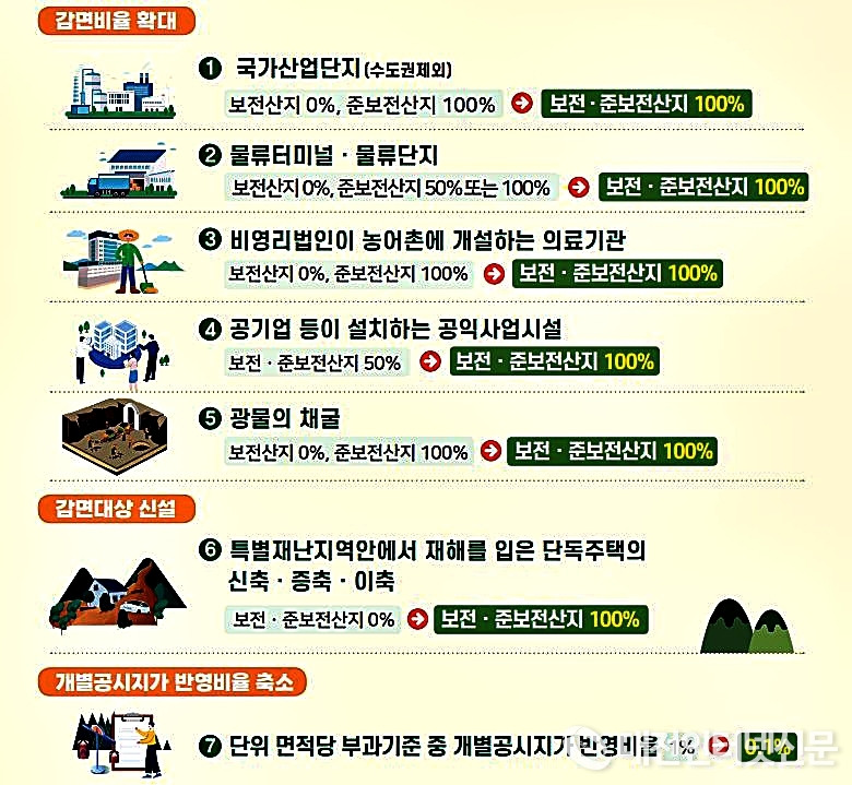 이에 따라 앞으로는 산지에 설치되는 국가산업단지, 물류터미널․물류단지 등 중요산업시설과 농어촌에 개설하는 비영리 의료기관 등 공익사업시설은 보전산지와 준보전산지 구분 없이 대체산림자원조성비를 100% 감면한다.