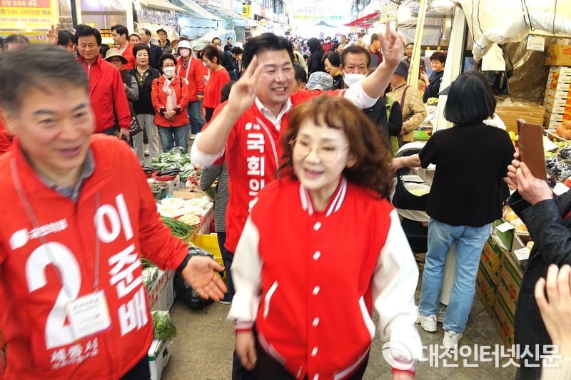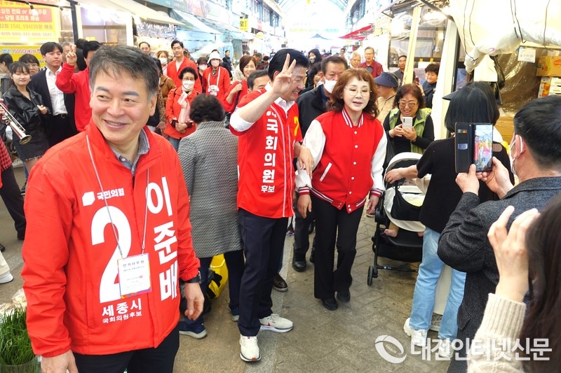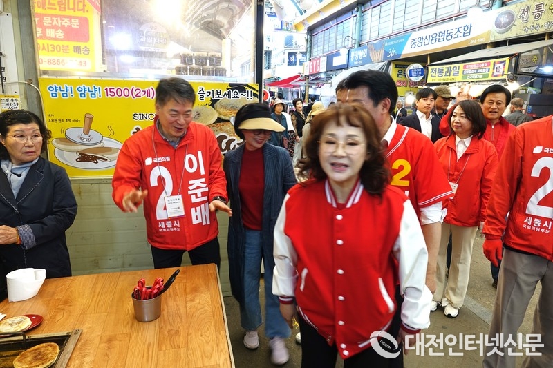 [대전인터넷신문=세종/최대열기자] 남행열차의 주인공 인기가수 김수희 씨가 선거운동 마지막 날인 9일 오전 세종시 조치원 전통시장을 방문, 이준배 후보와 시장 곳곳을 누비며 이준배 후보 지지를 호소했다.