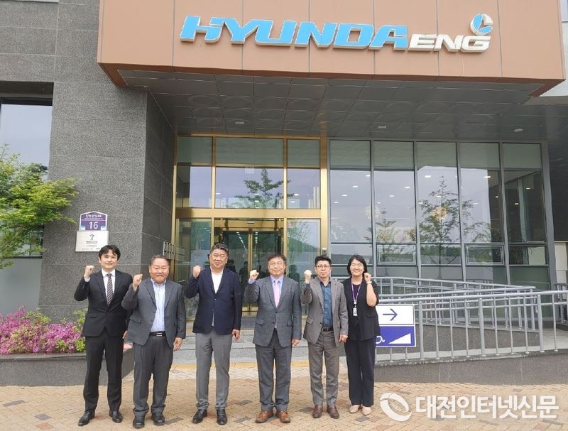 왼쪽부터 이재산 현다이엔지 부장, 이창호 부사장, 김성훈 대표이사, 이승원 경제부시장, 김종태 세종시 기업지원과장, 방지영 기업지원팀장. [사진-세종시]