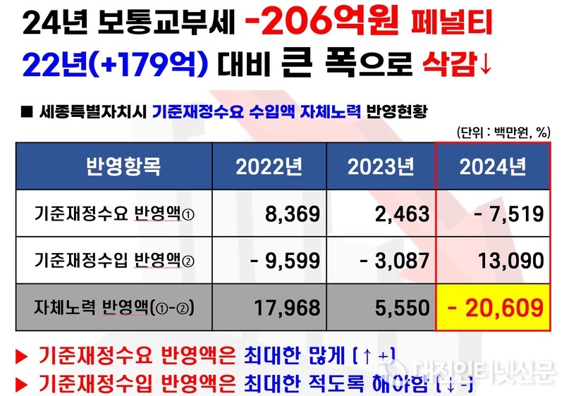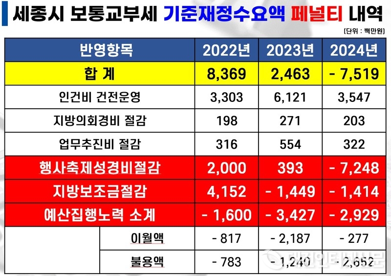 세종시 방만한 예산집행으로 가뜩이나 부족한 보통교부세 206억 9백만원 삭감당했다