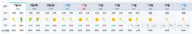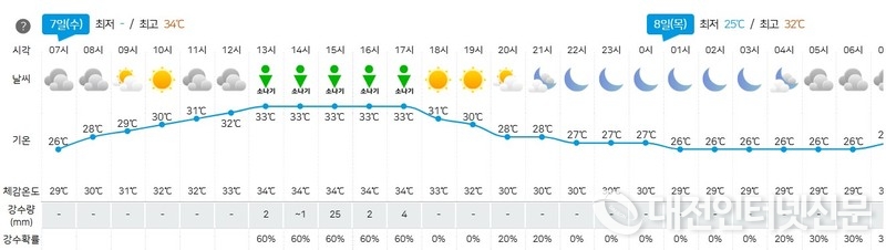 한편, 세종지역에는 오후 13시부터 17시까지 비나 소나기가 내릴 것으로 전망되면서 일시적으로 기온이 내려가겠지만 그친 뒤에는 습도가 높은 상태에서 다시 기온이 올라갈 것으로 전망된다.