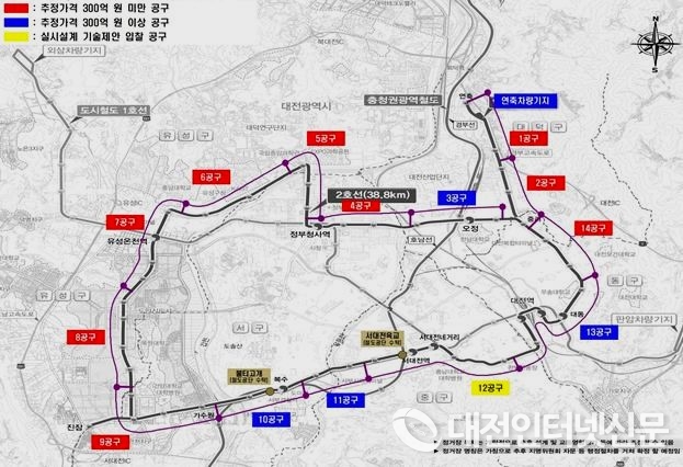대전 도시철도 2호선 트램 9월 첫 공사 발주 - 기재부, 실시설계 반영 총사업비 1조 5,069억원 최종 승인 - 총 15개 공구로 분할, 올해 하반기 6개 공구 선 발주 예정