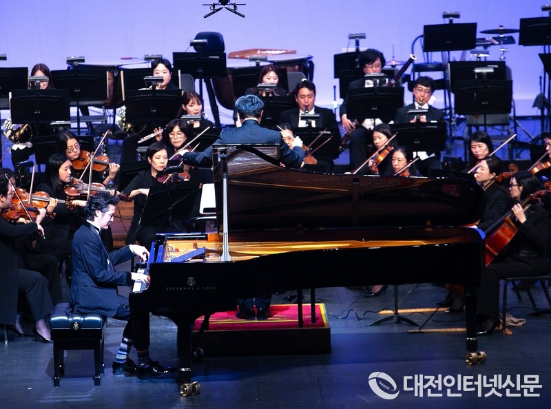 지난 30일 대전예술의전당 아트홀에서 열린 '제14회 동서커피클래식'에서 피아니스트 조재혁이 공주시충남교향악단(지휘 정나라)과 협연을 펼치고 있다. [사진-동서식품]